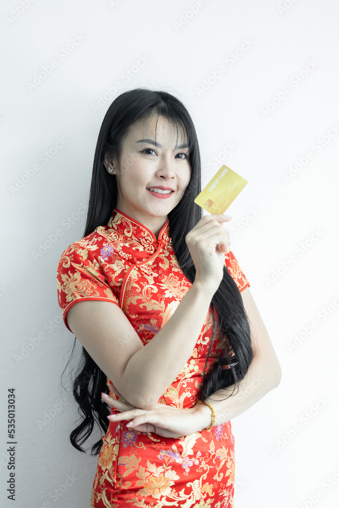 Asian woman wearing traditional cheongsam qipao dress showing presenting bank business credit card on white background, Chinese new year shopping, Shopping online, Chinese woman in traditional dress.