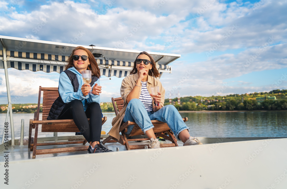 Two young caucasian women girlfriends are relaxing on a boat on the river with champagne enjoying a boat trip