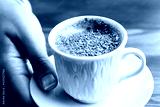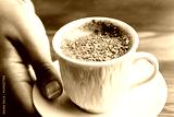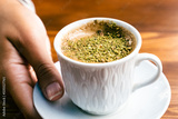 Pistachio coffee in a white cup. Woman with coffee in hand. Turkish coffee with pistachio.