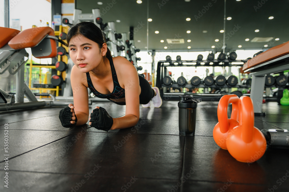 Asian fit woman doing plank core exercise in gym, Crossfit workout for beginners to strength and cardio workout.