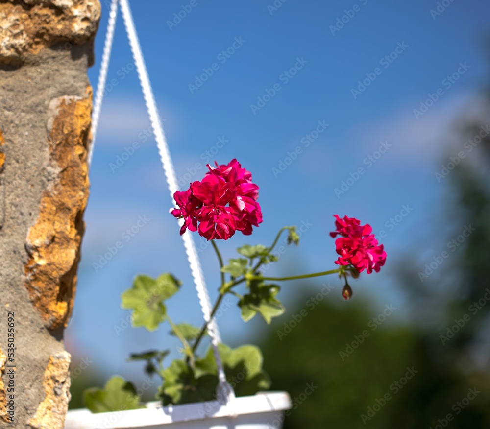 Pink geranium flowers. blue sky. Beautiful little geranium flower. Ivy Pelargonium.