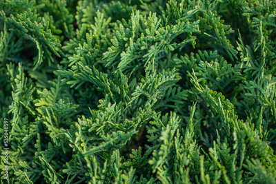 Natural background of young thuja branches. Background from green branches of thuja for design or project. Thuja green natural background. Thuja texture.