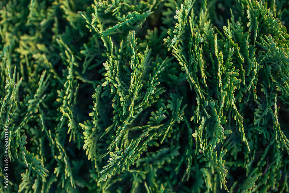 Textured background from thuja coniferous branches. Thuja green natural background.