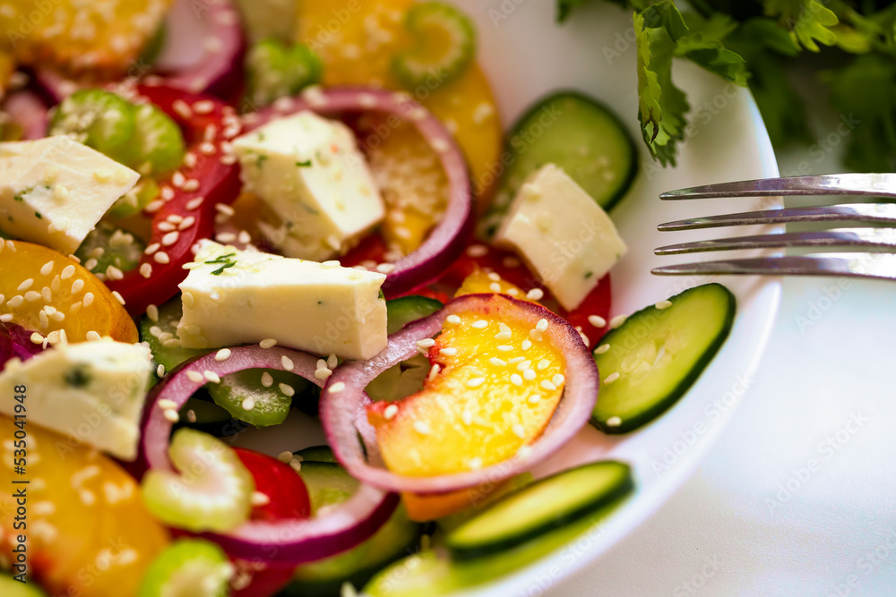 Various vegetables in a white plate: bell peppers, cucumbers, tomatoes, cheese, red onions, sesame seeds, celery, peaches.Vegetable salad with peaches.Vegan food and snacks. Clean eating, raw