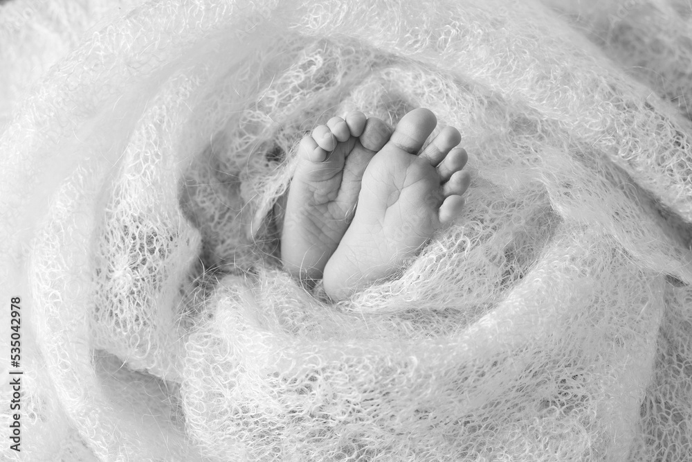 Closeup picture of newborn baby feet on white knitted plaid. Fine concept of the childhood and motherhood