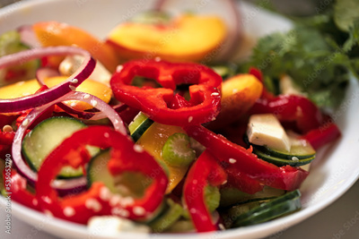 Salad of bell peppers, cucumbers, peaches, celery, red onions and sesame seeds. Vegan food and snacks. Clean eating, raw food, detox, plant based