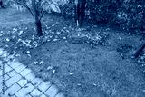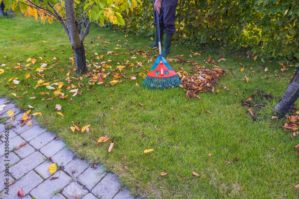 View of person cleaning grass from fallen leaves with rake on autumn sunny day.