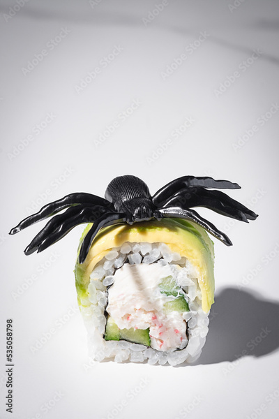 Sushi Halloween on white background. Maki roll with fake black spider on top. Party food. Spooky, scary, fun California with avocado. Japanese sushi bar, restaurant holiday menu. Vertical, copy space