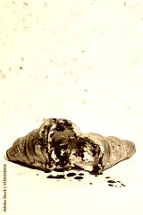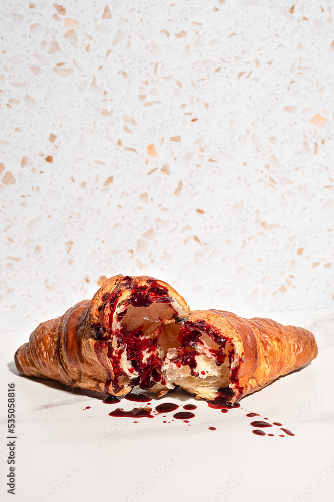 Croissant for Halloween. Bloody pastry on light kitchen wall background. Scary, spooky, horror party food with fake blood. Sweet dessert deadly cut. Creative, stylish. Bakery holiday special menu