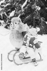 cute beautiful girl in fashion stylish winter clothes fur coat and fur hat walking and hugging with llama alpaca pet in snowy pine forest, winter spirit and having fun