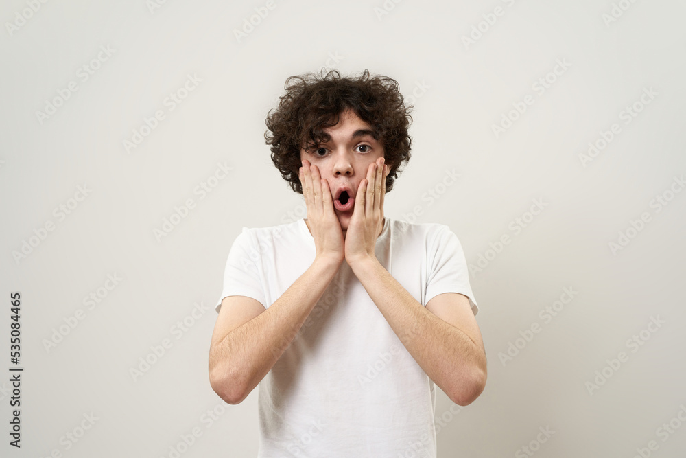 Front view of shocked teenage boy with open mouth