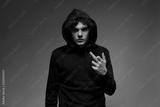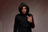 Confident caucasian teenage boy show middle finger
