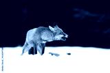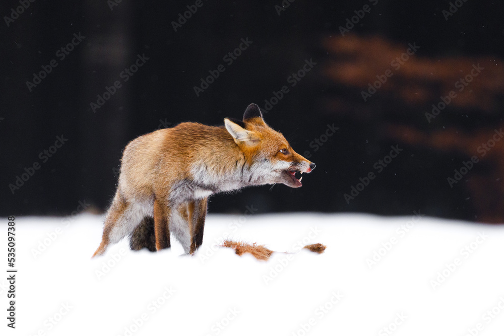 Hunting fox. Red fox, Vulpes vulpes, growls and shows teeth as defends prey. Vixen tears and feeds caught hare. Hunter with prey. Wild predator in snow on forest meadow. Wildlife from winter nature.