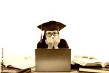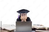 Beautiful graduate afraid in front of laptop
