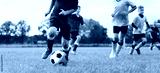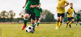 Competition between players running and kicking football ball. Young boys playing soccer game. Kids having fun in sport. Happy kids compete in football game. Running soccer players. Football school