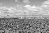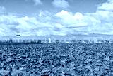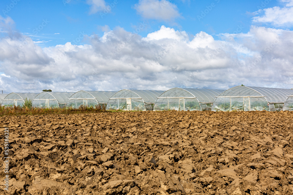 Greenhouses tunnel covered with transparent polythene plastic film, growing green vegetable plants. Agricultural field, prepared soil for winter time. Blue sky.