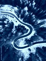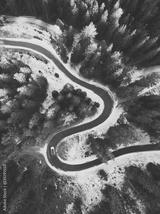 Aerial view of winding curved road with car and fall forest with autumn color trees in Italy.