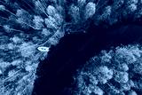 Aerial view of blue winding river and fall forest with autumn colorful trees.
