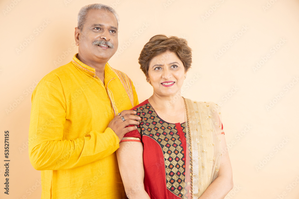 Portrait of senior indian couple wearing traditional cloths standing together isolated on plane studio background.