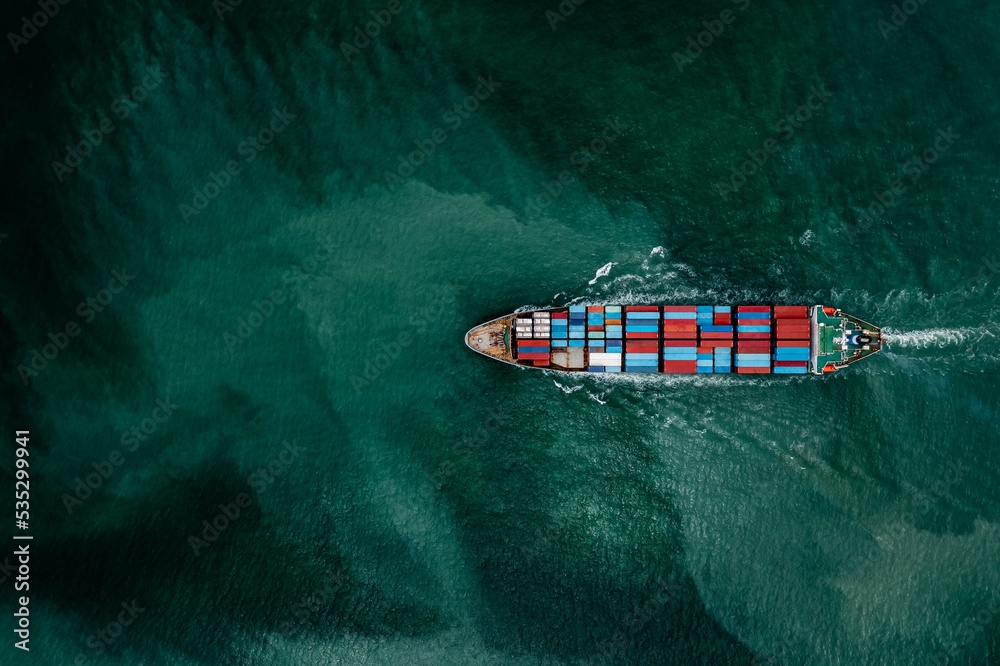 Container ship transporting cargo logistic to import export goods internationally around the world, including Asia Pacific and Europe, business and industry service of goods logistic transportation