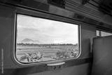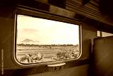 Riding a train in Indonesia sitting by the window watching the tracks and the view outside the window of the train speeding towards its destination