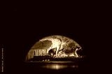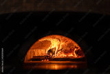Pizza concept. Preparing traditional italian pizza. Long shovel for pizza, baking dough in a professional oven with open fire in interior of modern restaurant kitchen
