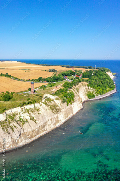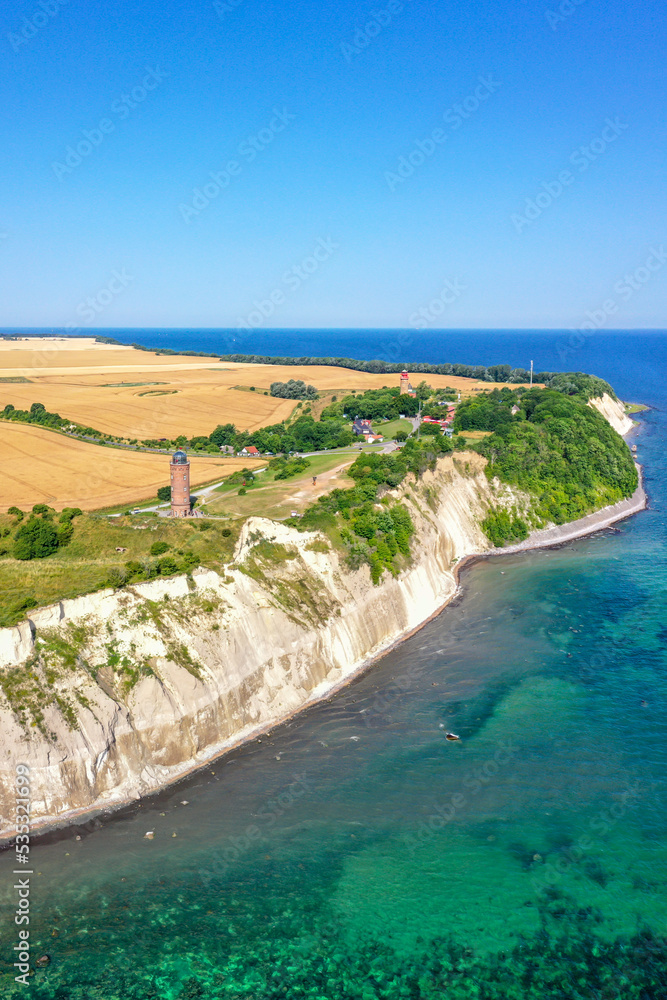 Aerial view of Kap Arkona on Rügen island at the Baltic Sea with lighthouse and chalk cliffs portrait format in Germany
