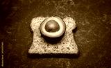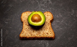 A half of an avocado with a seed sitting on a piece of whole wheat toast on a granite countertop