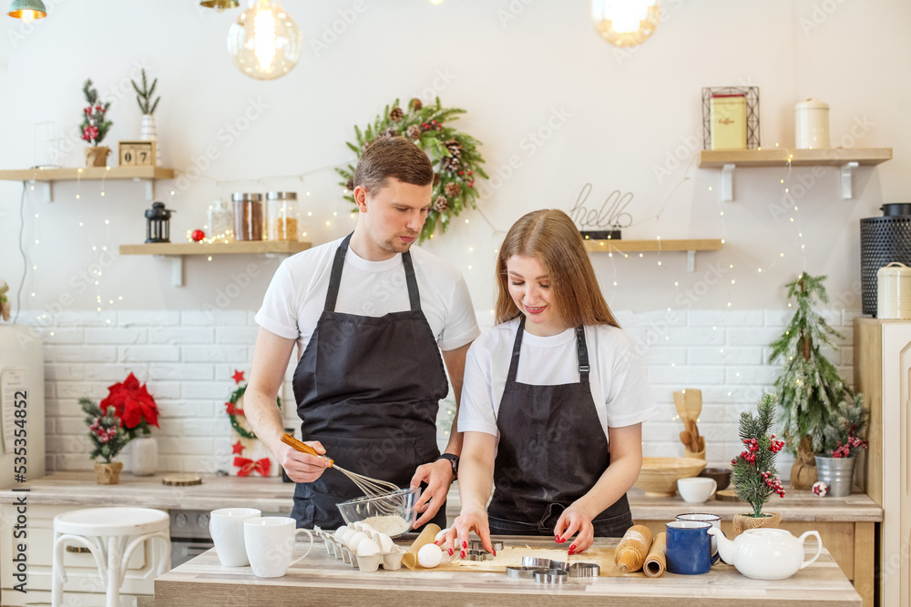 Young happy couple enjoying and preparing christmas cookies together in their kitchen.