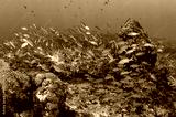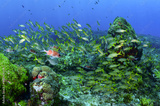 Shoal of bluestriped grunt fish swimming over coral reef in the waters of Fernando de Noronha, Brazil