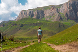 A girl walks along a dirt road in the mountains
