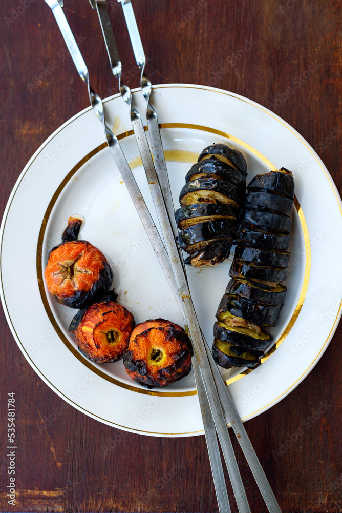 Roasted tomatoes and zucchini with metal skewers put on plate on wooden table. Healthy vegan kabobs prepared on grill upper close view
