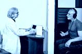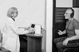 Audiological exam. Audiologist doing hearing check-up to senior man in soundproof audiometric booth. Hearing loss treatment, side view