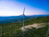 Aerial view of Windmill Energy Farm at sunset. Wind turbines for electric power with clean and Renewable Energy