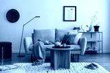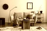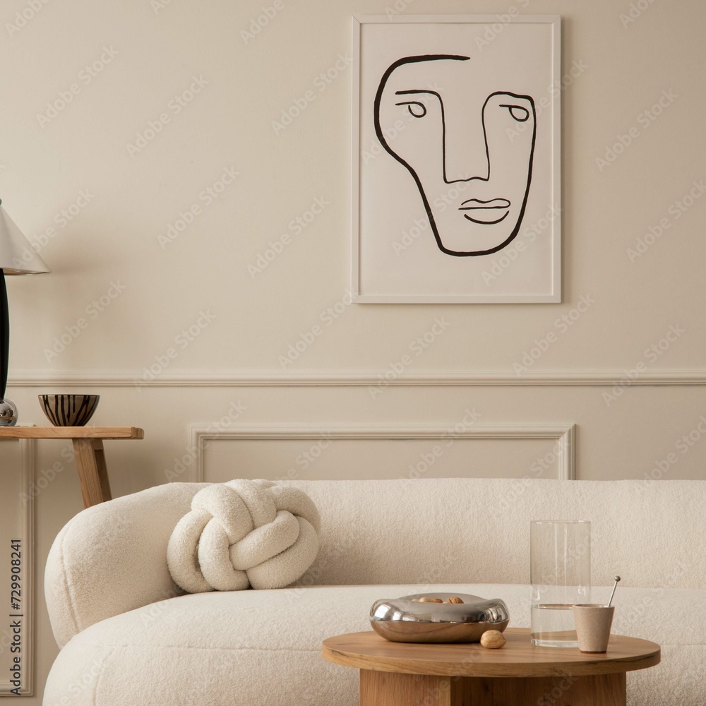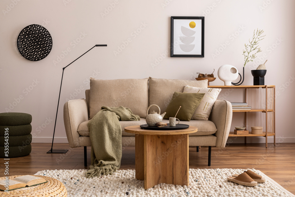 Domestic and cozy interior of living room with beige sofa, wooden shelf, green plaid, coffee table, decoration and boucle carpet. Mock up poster frame. Beige wall. Home decor. Template.