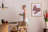 Interior design of aesthetic and elegant room with woman in dress, mock up poster frame, round table, vegetables, rattan chair and personal accessories. Stylish home decor. Template.