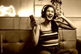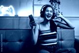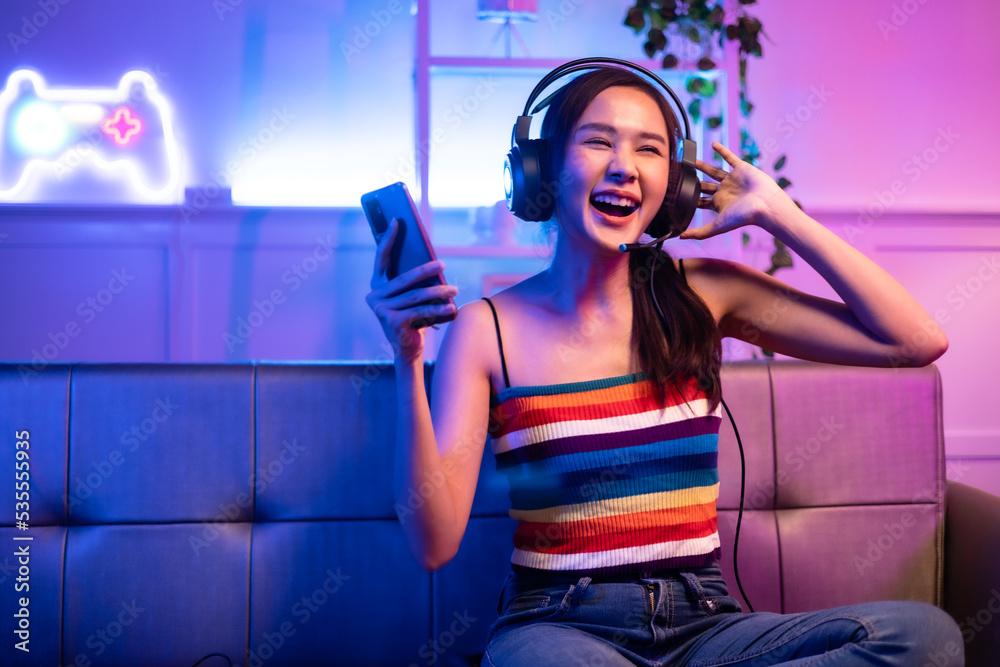Asian young beautiful woman streamer listening to music dancing and listening music at Home Interior, Residential Building.