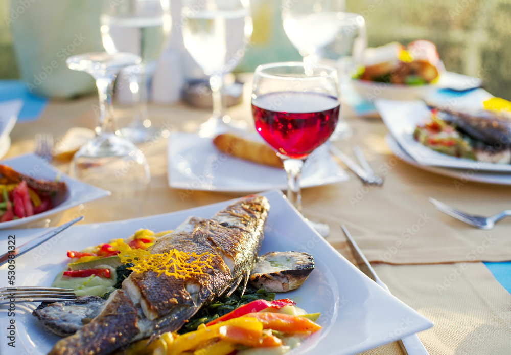 Flock of domesticated turkeys graze on a green backyard in the countryside on a summer sunny day. Farming.