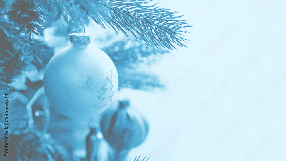 Glass white ball on a Christmas tree in monochrome blue gentle tones, toned, soft focus. Christmas background with copy space