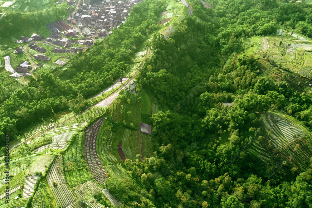Village near terrace farmland in mount Sumbing