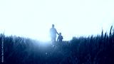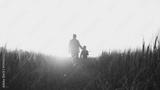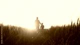 Farmer and his son in front of a sunset agricultural landscape. Man and a boy in a countryside field. Fatherhood, country life, farming and country lifestyle.