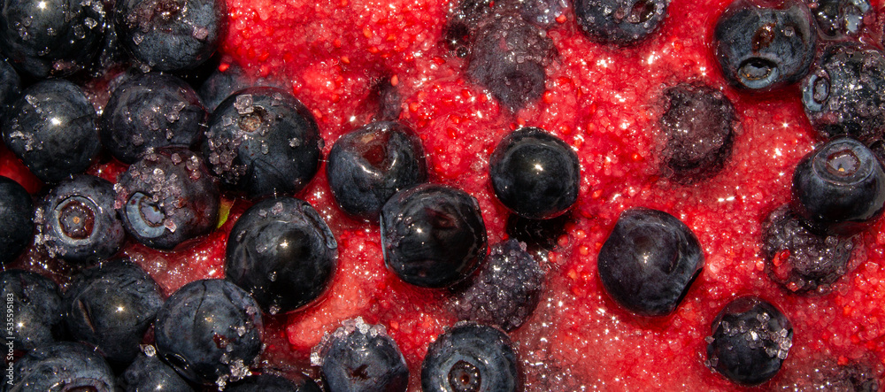 Blueberries and strawberries in sugar.Background of strawberries in sugar.Blueberries in sugar.Wild berries background.