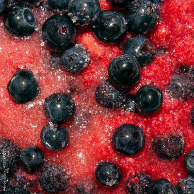 Blueberries and strawberries in sugar.Background of strawberries in sugar.Blueberries in sugar.Wild berries background.