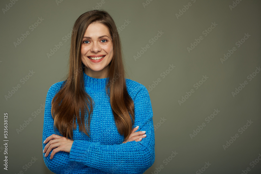 Smiling beautiful woman in blue warm knitted sweater. Isolated female portrait.