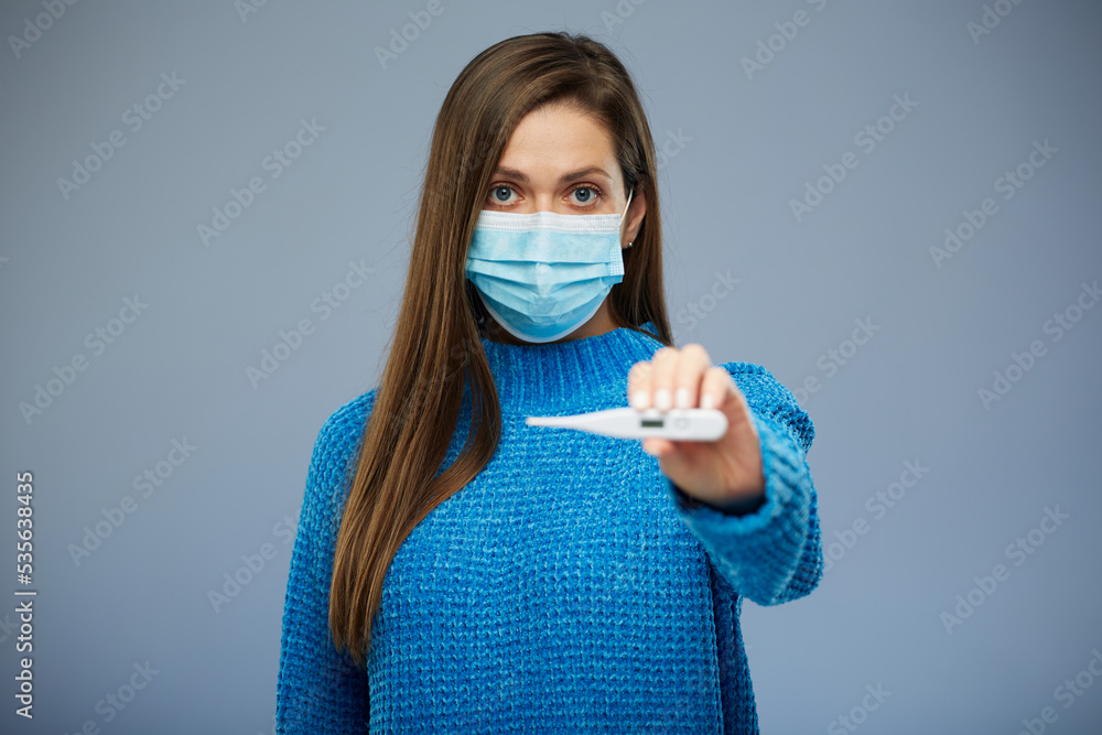 Woman wearing blue medical mask showing thermometer. Health and medical isolated concept portrait.