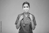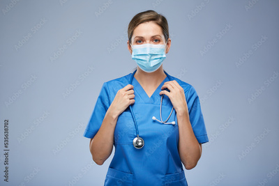 Nurse woman or doctor in blue medical mask. Isolated female portrait.