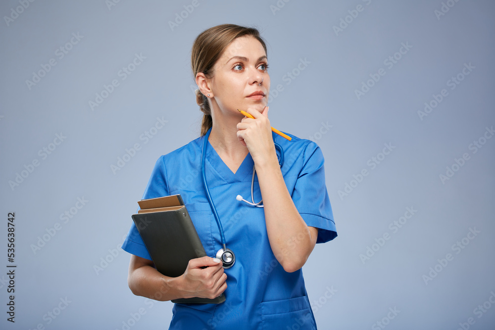 Thinking medical student intern or teacher, doctor woman holding books. Isolated female portrait.