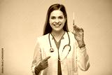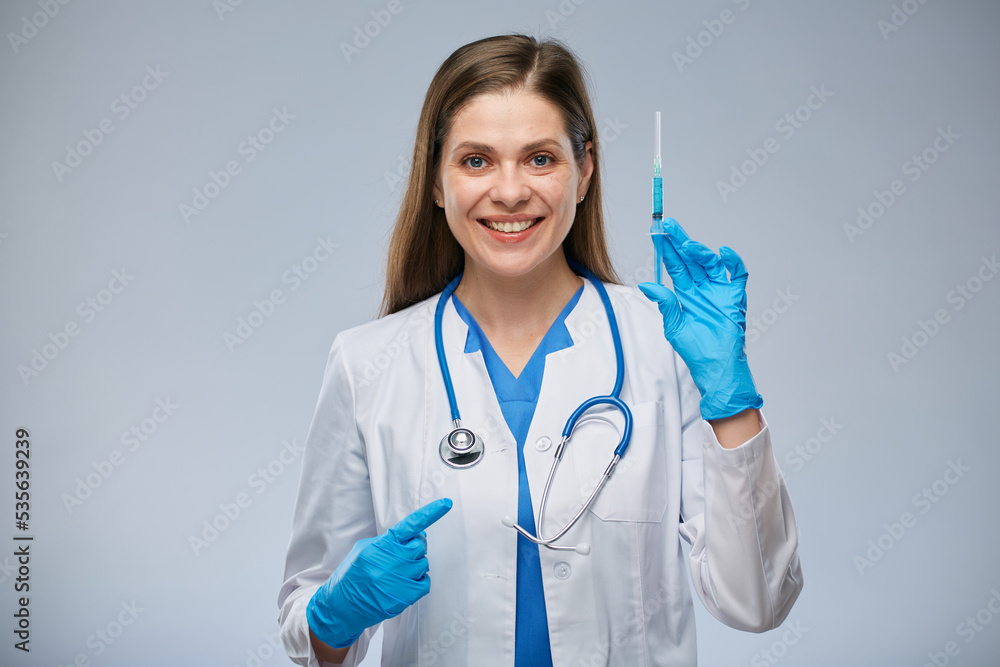 Smiling woman doctor holding syringe with vaccine, pointing finger. Isolated female medical worker portrait.