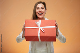 Happy woman in white suit holding red gift box. Isolated female portrait.