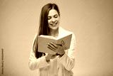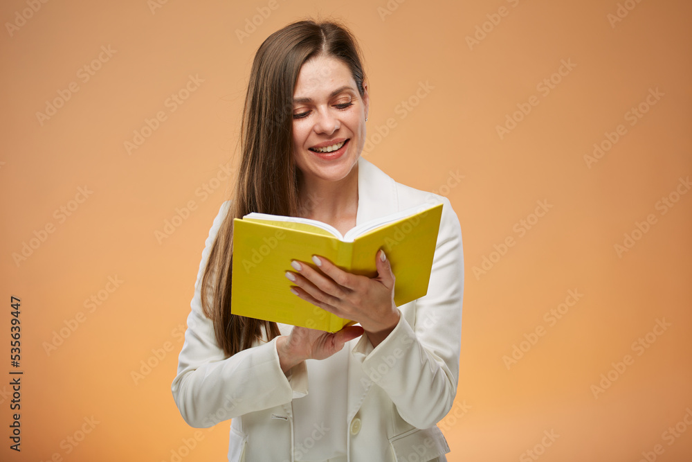 Business woman or teacher reading open yellow book, isolated female portrait.